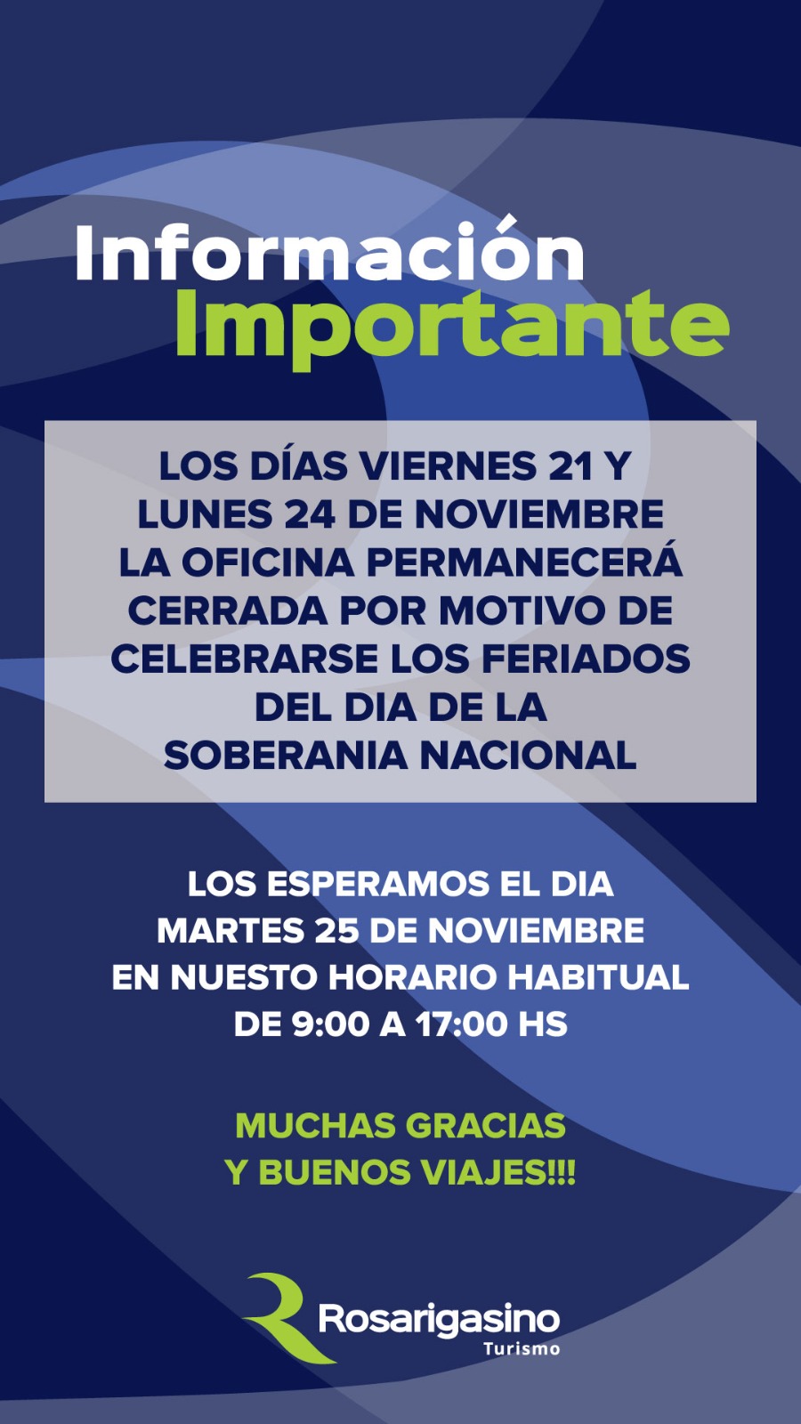 Los días viernes 21 y lunes 24 de noviembre la oficina permanecerá cerrada por motivo de celebrarse los feriados del dia de la Soberanía Nacional.Los esperamos el día martes 25 de noviembre en nuestro horario habitual de 9:00 hs. a 17:00 hs.